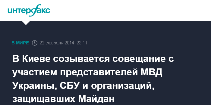 Киев. 22 февраля. INTERFAX.RU - Назначенный Верховной Радой и.о. министра внутренних дел Украины Арсен Аваков сообщил, что в ближайшее время пройдет большое совместное совещание с участием органов МВД, Службы безопасности Украины и сил, которые принимали участие в защите Майдана.