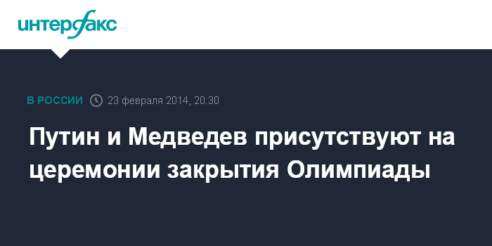 Москва. 23 февраля. INTERFAX.RU - Сочи. 23 февраля. ИНТЕРФАКС - Президент России Владимир Путин и премьер-министр Дмитрий Медведев присутствуют на церемонии закрытия Олимпиады-2014 в Сочи.
