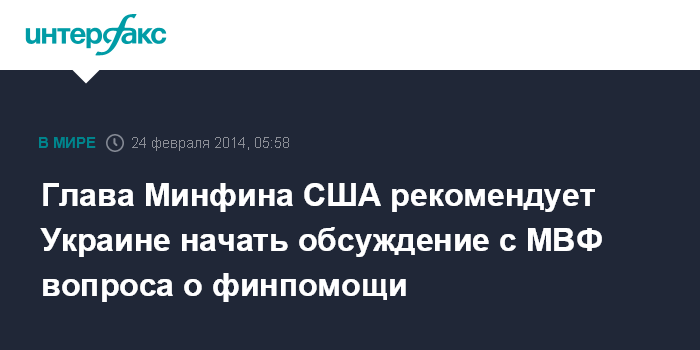 Москва. 24 февраля. INTERFAX.RU - Министр финансов США Джек Лью рекомендовал Украине начать переговоры с Международным валютным фондом (МВФ) о предоставлении ей финансовой помощи сразу же после формирования переходного правительства.