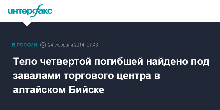 Москва. 24 февраля. INTERFAX.RU - При разборе завалов торгового центра в Бийске (Алтайский край), где накануне произошел взрыв газа, обнаружено тело еще одной, четвертой погибшей, сообщили в понедельник агентству "Интерфакс-Сибирь" в пресс-центре регионального следственного управления СК РФ.