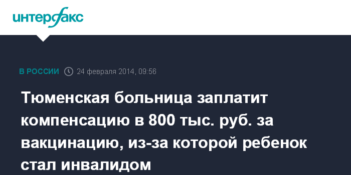 Москва. 24 февраля. INTERFAX.RU - Ишимский горсуд Тюменской области взыскал с больницы 800 тыс. рублей в пользу маленького ребенка, который получил инвалидность в результате вакцинации, сообщает пресс-служба облпрокуратуры в понедельник.