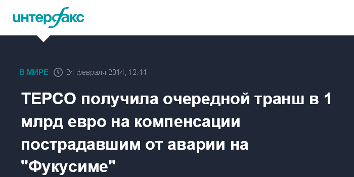 Москва. 24 февраля. INTERFAX.RU - Tokyo Electric Power Company (TEPCO), компания-оператор АЭС "Фукусима-1", получила очередной транш на выплату компенсаций пострадавшим от аварии на станции, говорится в сообщении компании.