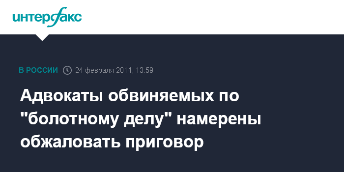 Москва. 24 февраля. INTERFAX.RU - Защита фигурантов "болотного дела", которых в понедельник приговорили к срокам от условного наказания до четырех лет колонии, будет обжаловать приговор, сообщили адвокаты журналистам.