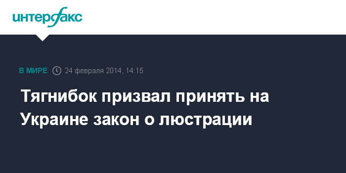 Москва. 24 февраля. INTERFAX.RU - Лидер фракции праворадикальной партии "Свобода" Олег Тягнибок призвал парламентские фракции совместно разработать и принять закон о люстрации.