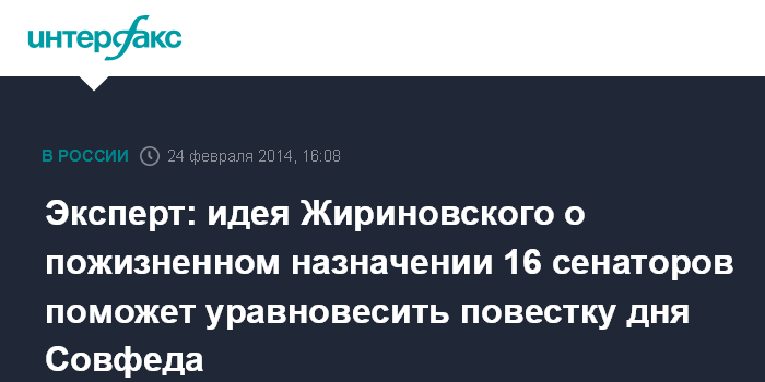 Москва. 24 февраля. INTERFAX.RU - Предлагаемый лидером ЛДПР Владимиром Жириновским законопроект, предусматривающий пожизненное назначение 16 членов Совета Федерации, позволит развить в верхней палате парламента сбалансированную повестку дня с учетом позиций регионов и федерального центра, считает президент Центра стратегических коммуникаций Дмитрий Абзалов.