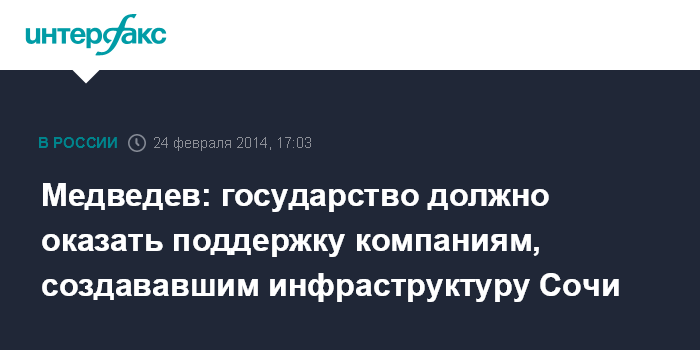 Москва. 24 февраля. INTERFAX.RU - Премьер-министр РФ Дмитрий Медведев считает, что государство должно оказать поддержку частным и государственным компаниям, участвовавшим в создании инфраструктуры олимпийского Сочи.