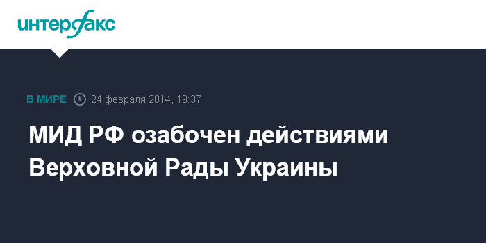 Москва. 24 февраля. INTERFAX.RU - В Москве сомневаются в легитимности действий Верховной рады Украины. "Вызывают глубокую озабоченность с точки зрения легитимности действия в Верховной Раде Украины", - говорится в заявлении МИД РФ, опубликованном на сайте ведомства в понедельник.