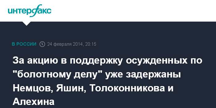 Москва. 24 февраля. INTERFAX.RU - За несанкционированную акцию в поддержку осужденных по болотному делу в центре столице задержаны более двадцати оппозиционеров.
