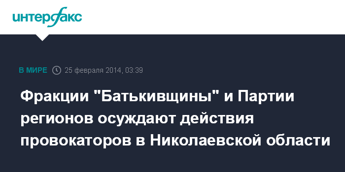 Киев. 25 февраля. ИНТЕРФАКС-УКРАИНА - Представители фракций "Батькивщина" и Партии регионов в Николаевской облгосадминистрации в совместном заявлении осудили попытку дестабилизации ситуации в Николаеве и области.