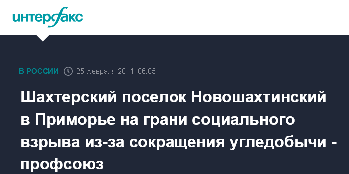 Владивосток. 25 февраля. ИНТЕРФАКС - ДАЛЬНИЙ ВОСТОК - Работники разрезоуправления (РУ) "Новошахтинское" в Приморском крае опасаются массовых сокращений из-за резкого снижения плана по угледобыче, градообразующее предприятие, как и весь шахтерский поселок Новошахтинский на грани социального взрыва, сообщил агентству "Интерфакс - Дальний Восток" председатель профсоюза РУ Евгений Козаков.