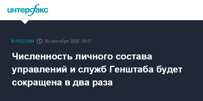"По указанию министра обороны Анатолия Сердюкова начались мероприятия по оптимизации всех главных управлений и служб Генерального штаба российской армии, общая численность сокращений достигнет почти 50%. Сроки реорганизации Генштаба завершатся к 1 марта 2009 года", - сообщил собеседник агентства во вторник. По его словам, сокращение численности управлений и служб, личного состава относится ко всем без исключения главным управлениям, включая такие важные, как Главное оперативное управление, главное разведывательное управление и главное организационно-мобилизационное управление.