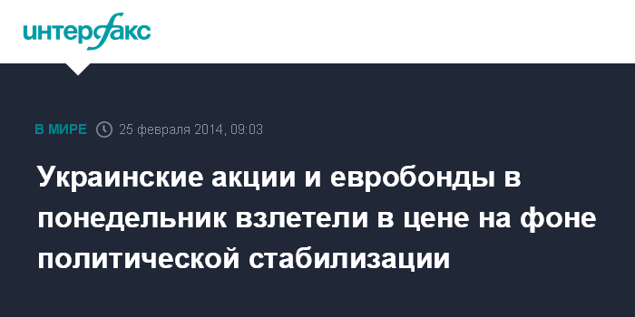 Киев. 25 февраля. INTERFAX.RU - "Быки" украинского рынка акций в понедельник устроили ралли на фоне сигналов о стабилизации политической ситуации в стране: индекс "Украинской биржи" по итогам торгов вырос на 15,21%, до 1075,97 пункта, индекс ПФТС - на 13,05%, до 355,91 пункта.