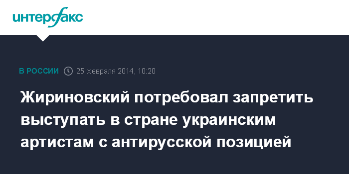 Москва. 25 февраля. INTERFAX.RU - Лидер ЛДПР Владимир Жириновский выступил за запрет концертной деятельности в РФ украинских артистов с антироссийской позицией