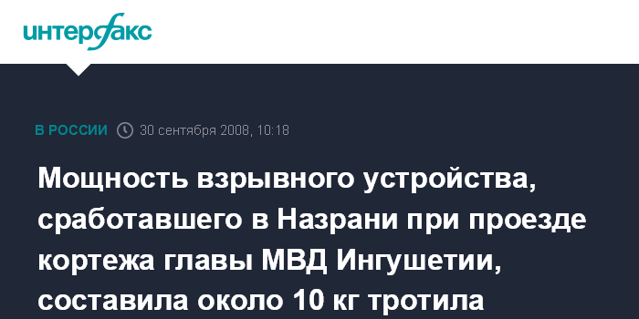 Москва. 30 сентября. INTERFAX.RU - Взрывное устройство, сработавшее утром во вторник при проезде кортежа главы МВД Ингушетии, было эквивалентно примерно 10 кг тротила, сообщил агентству "Интерфакс- Юг" источник во взрыво-технической бригаде, работающий на месте происшествия.