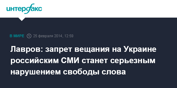 Москва. 25 февраля. INTERFAX.RU - Запрет вещания на Украине российских телеканалов, в случае, если он будет введен, станет серьезным нарушением прав человека, заявил глава МИД РФ Сергей Лавров.