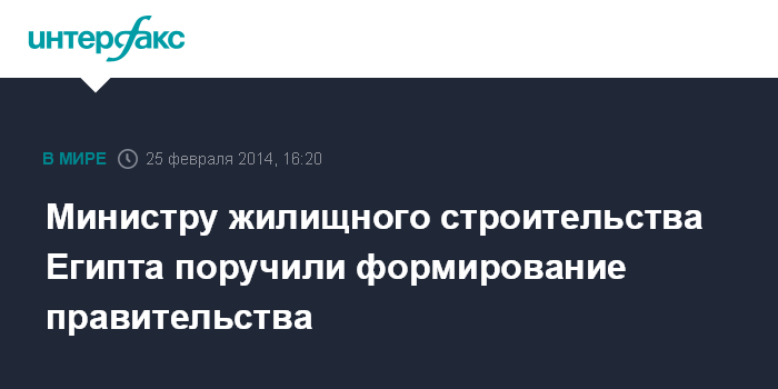 Дубай. 25 февраля. INTERFAX.RU - Временный президент Египта Адли Мансур во вторник поручил формирование нового правительства Ибрагиму Махлябу, который руководил жилищным строительством в предыдущем кабинете министров, сообщает египетская газета "Аль-Ахрам".