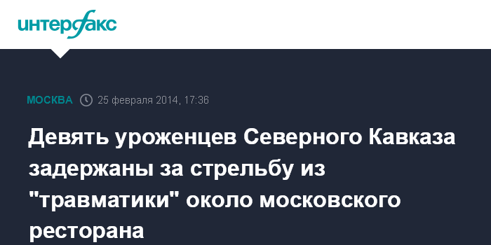 Москва. 25 февраля. INTERFAX.RU - Девять уроженцев Северного Кавказа задержаны в столице за устроенный ими конфликт со стрельбой возле ресторана, сообщили "Интерфаксу" в пресс-службе ГУ МВД России по Москве.