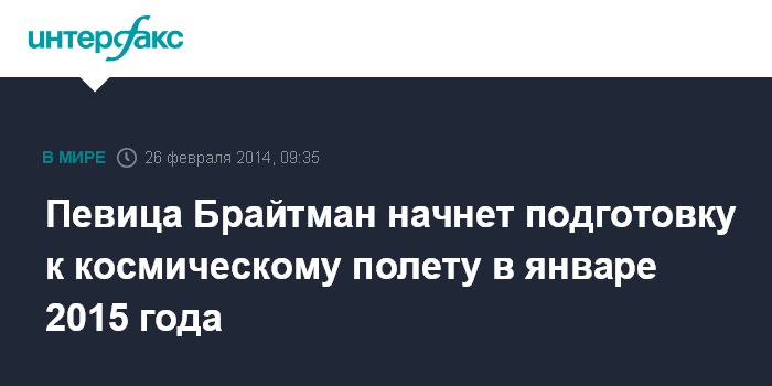Москва. 26 февраля. INTERFAX.RU - Британская певица Сара Брайтман, которая должна полететь на Международную космическую станцию (МКС) осенью 2015 года, приступит к тренировкам в Центре подготовки космонавтов (Звездный городок) после январских праздников в следующем году.