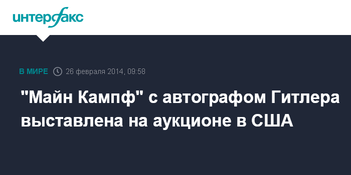 Москва. 26 февраля. INTERFAX.RU - Скандально известная книга Адольфа Гитлера "Майн Кампф", подписанная самим автором, будет продана в четверг в Лос-Анджелесе на интернет-аукционе, сообщили в аукционном доме Nate D. Sanders