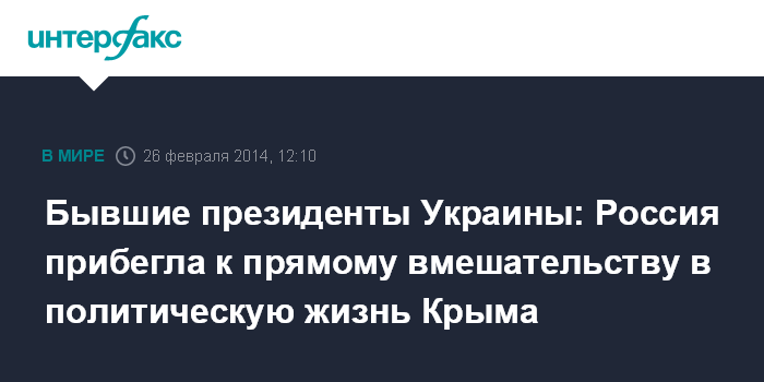 Киев. 26 февраля. INTERFAX.RU - Три президента Украины - Леонид Кравчук, Леонид Кучма и Виктор Ющенко - заявляют о прямом вмешательстве России в политическую жизнь Крыма.