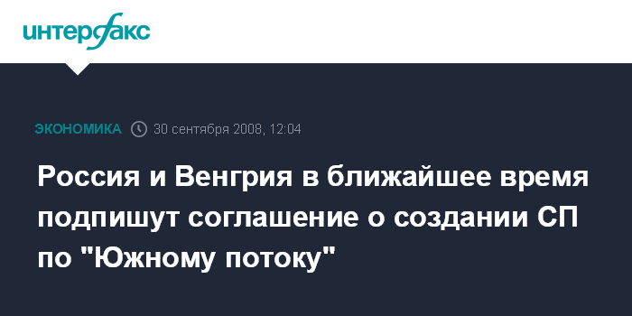 Москва. 30 сентября. INTERFAX.RU - Россия и Венгрия в ближайшее время подпишут соглашение о создании совместного предприятия - оператора венгерской части газопровода "Южный поток", заявил первый вице-премьер РФ Виктор Зубков.