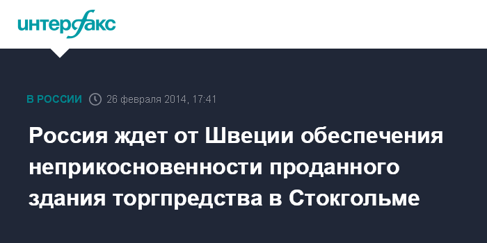 "К шведской стороне был обращен настоятельный призыв к решению ряда спорных вопросов двусторонних отношений, прежде всего урегулированию ситуации вокруг офисно-жилого здания Торгового представительства России в Стокгольме в связи с проведением аукциона по принудительной продаже этой обладающей дипломатическим иммунитетом российской недвижимости. Было подчеркнуто, что в Москве ждут от шведских властей исчерпывающих мер по обеспечению безопасности и неприкосновенности российской миссии в Стокгольме в соответствии с международно-правовыми обязательствами Швеции", - заявили на Смоленской площади.