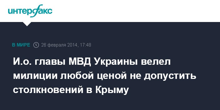 Киев. 26 февраля. INTERFAX.RU - Правоохранительным органам Крыма поставлена задача не провоцировать конфликты и делать все для недопущения столкновений с пророссийскими силами, заявляет и.о. министра внутренних дел Украины Арсен Аваков.