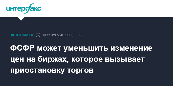 Москва. 30 сентября. INTERFAX.RU - Федеральная служба по финансовым рынкам (ФСФР) в течение дня во вторник может принять решение об уменьшении изменения цен на биржах, которое вызывает приостановку торгов, сообщил агентству "Интерфакс-АФИ" глава НАУФОР Алексей Тимофеев.
