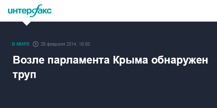 Киев. 26 февраля. INTERFAX.RU - Труп неизвестного мужчины без признаков телесных повреждений обнаружен возле Верховного Совета Крыма в среду во время митинга. Медики называют предварительную причину смерти - острый сердечный приступ.