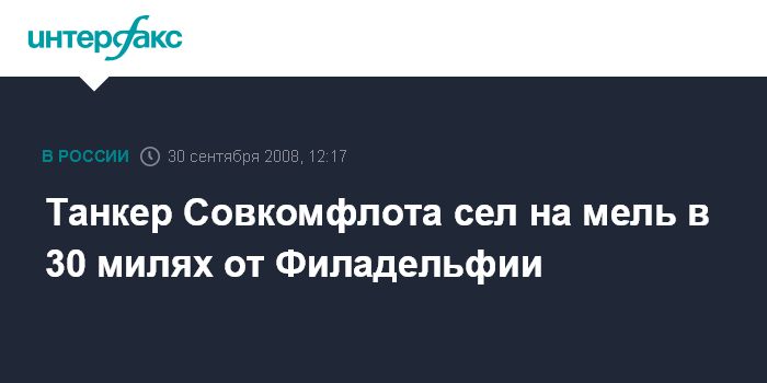 Москва. 30 сентября. INTERFAX.RU - Танкер "Тучков Мост" (находится в коммерческом управлении Sovcomflot UK) в понедельник вечером сел на мель в 30 милях к югу от Филадельфии (США) в канале Делавар, сообщается в телеграмме, опубликованной "Морским бюллетенем".