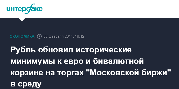 Москва. 26 февраля. INTERFAX.RU - Доллар США и евро заметно подросли на "Московской бирже" (MOEX: MOEX) в среду, обновив долгосрочные максимумы. Рубль обновил исторический минимум по отношению к бивалютной корзине вследствие негативного настроя инвесторов по отношению к развивающимся рынкам, а также на фоне рекордного падения украинской гривны.