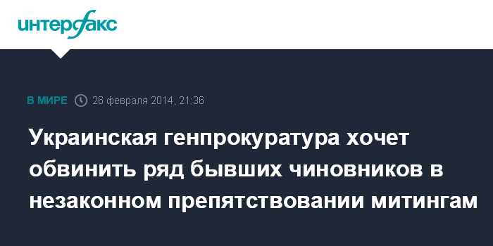 Москва. 26 февраля. INTERFAX.RU - Ряду бывших украинских чиновников различного уровня будет предъявлено подозрение в незаконном препятствовании проведению митингов, сообщил и.о. генпрокурора Украины Олег Махницкий.