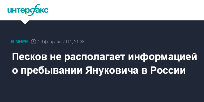Москва. 26 февраля. INTERFAX.RU - Пресс-секретарь президента России Дмитрий Песков не располагает информацией о пребывании Виктора Януковича в России.