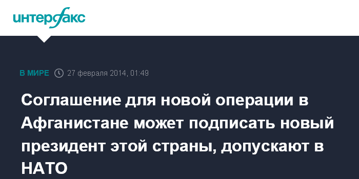 Брюссель. 27 февраля. ИНТЕРФАКС - В НАТО допускают, что необходимое для начала новой операции в Афганистане соглашение может подписать не Хамид Карзай, а новый президент страны.