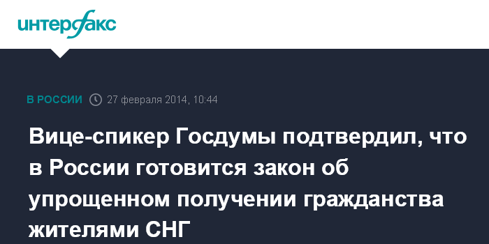 Москва. 27 февраля. INTERFAX.RU - Во властных структурах России готовится проект закона об упрощенном порядке предоставления российского гражданства гражданам СНГ, сообщил первый вице-спикер Госдумы от фракции "Единая Россия" Александр Жуков.