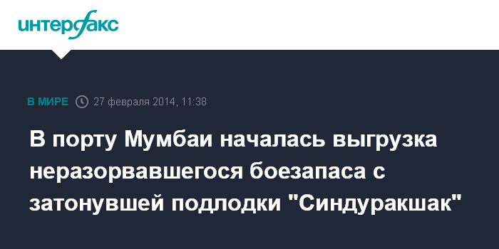 Дели. 27 февраля. INTERFAX.RU - Шесть месяцев спустя после гибели подводной лодки "Синдуракшак" ВМС Индии началась сложнейшая операция по выгрузке неразорвавшегося боезапаса с субмарины проекта 877ЭКМ российской постройки, сообщает газета Times of India.