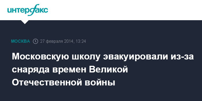 Москва. 27 февраля. INTERFAX.RU - Московскую школу эвакуируют из-за обнаружения снаряда времен Великой Отечественной войны, найденного неподалеку во время земляных работ, сообщили "Интерфаксу" в пресс-службе столичного главка МВД.