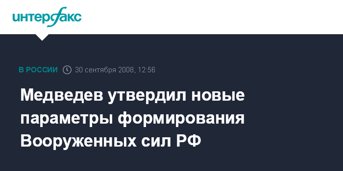 Москва. 30 сентября. INTERFAX.RU - Президент России Дмитрий Медведев утвердил новые параметры формирования вооруженных сил, которых они должны достичь к 2020 году. "Последние события обязывают нас укреплять безопасность своей страны и исходить при этом из реальных оценок потенциальных угроз. Именно на таких подходах основываются уточненные параметры боевого состава вооруженных сил, которые я утвердил 15 сентября", - сказал во вторник Медведев на церемонии представления офицеров, назначенных на высшие командные должности.