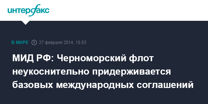 Москва. 27 февраля. INTERFAX.RU - Черноморский флот РФ неукоснительно придерживается международных соглашений, заявили в департаменте информации и печати МИД РФ.