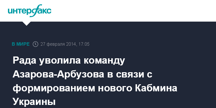 Киев. 27 февраля. INTERFAX.RU - Верховная Рада Украины приняла постановление об увольнении предыдущего состава Кабинета министров в связи с формированием нового.