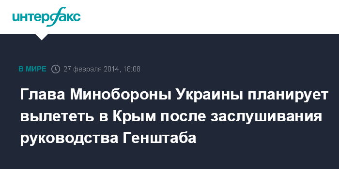 Москва. 27 февраля. INTERFAX.RU - Министр обороны Украины адмирал Игорь Тенюх планирует вылететь в Крым.