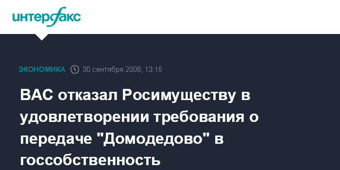 Москва. 30 сентября. INTERFAX.RU - Президиум Высшего арбитражного суда (ВАС) РФ во вторник отказал Росимуществу в удовлетворении требований о передаче в федеральную собственность здания аэровокзала "Домодедово".