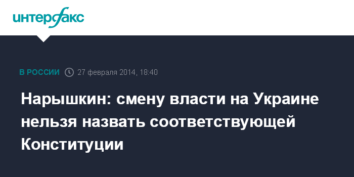 Москва. 27 февраля. INTERFAX.RU - Смена власти в любой стране должна происходить в соответствии с законом, то, что произошло на Украине, нельзя назвать соответствующим Конституции, заявил спикер Госдумы Сергей Нарышкин.