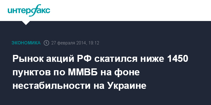 Москва. 27 февраля. INTERFAX.RU - Российский рынок акций в четверг упал ниже 1450 пунктов по индексу ММВБ из-за ослабления рубля, снижения Европы и нефти на фоне эскалации политической нестабильности на Украине.