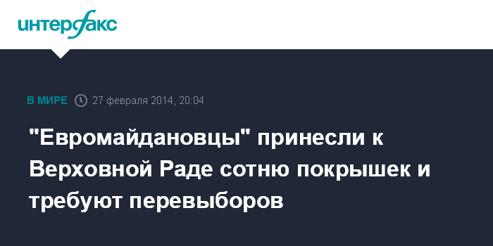 Киев. 27 февраля. INTERFAX.RU - Около сотни представителей Евромайдана принесли к зданию Верховной Рады около 100 автомобильных покрышек, на которых повесили плакаты "Немедленная тотальная люстрация", "Немедленные перевыборы Рады", "Немедленно Римский статут".