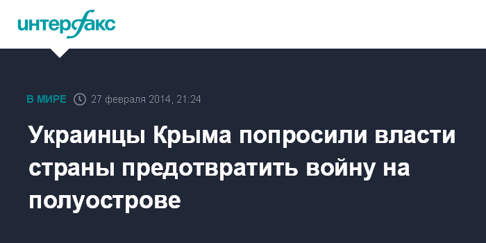 Киев. 27 февраля. INTERFAX.RU - Украинцы Крыма призывают украинскую власть предпринять все меры для защиты спокойствия и безопасности крымчан, а от европейских структур ждут влияния на позицию России относительно сепаратистских настроений.