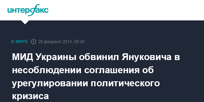 Киев. 28 февраля. INTERFAX.RU - Вся ответственность за несоблюдение соглашения об урегулировании политического кризиса от 21 февраля лежит на Викторе Януковиче, заявляет МИД Украины