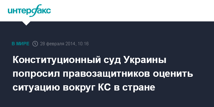 Киев. 28 февраля. INTERFAX.RU - В Конституционном суде Украины состоялось собрание судей, по итогам которого было принято обращение в европейские и международные правозащитные организации в связи с принятым 24 февраля Верховной радой постановлением "О реагировании на факты нарушении судьями КС Украины присяги судьи".