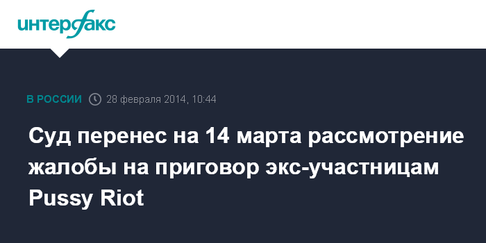 Москва. 28 февраля. INTERFAX.RU - Президиум Мосгорсуда перенес на 14 марта рассмотрение надзорной жалобы на приговор в отношении бывших участниц панк-группы Pussy Riot, осужденных за акцию в храме Христа Спасителя.