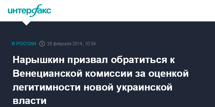 Москва. 28 февраля. INTERFAX.RU - Спикер Госдумы Сергей Нарышкин предлагает попросить Венецианскую комиссию оценить легитимность нынешней власти на Украине.